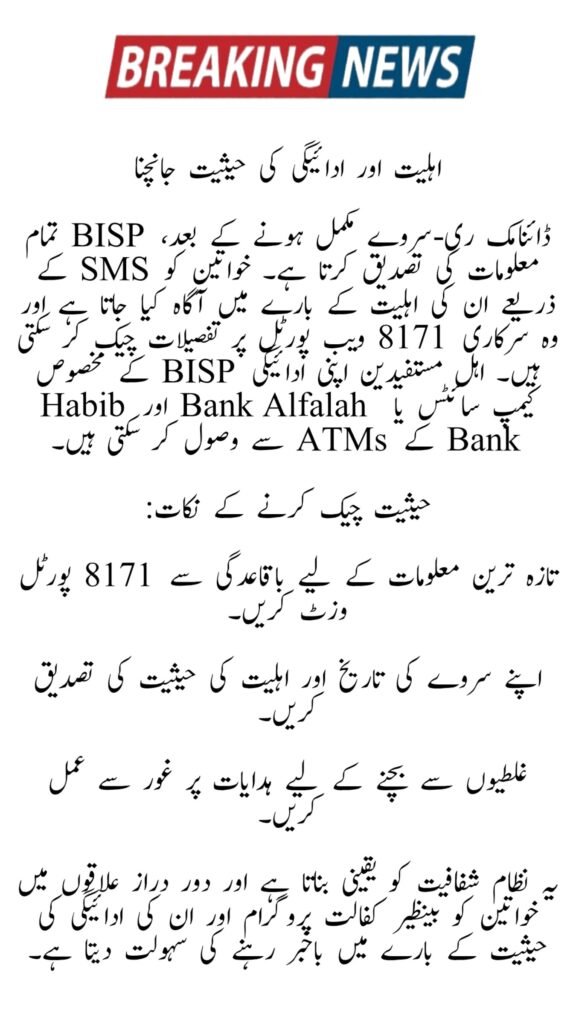 After completing the re-survey, BISP verifies all information. Women are informed about their eligibility via SMS and can check details online at the official 8171 web portal. Eligible beneficiaries can collect their payments from designated BISP campsites or ATMs like Bank Alfalah and Habib Bank.
