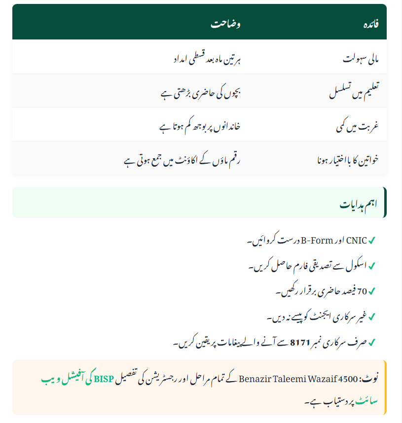 Benazir Taleemi Wazaif 4500 is a government initiative that helps poor families keep their children in school by covering essential educational costs.