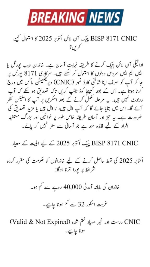 The BISP 8171 CNIC Check Online October 2025 is the fastest way for families to confirm their eligibility and payment. With just a CNIC number, households can track their Rs. 13,500 installment, avoid delays, and secure their money safely. In this article, we are sharing all the details about eligibility, documents, and online verification. Families are advised to always use the official portal bisp.gov.pk or 8171 SMS service for checking status. By doing so, they can get timely support and continue to manage household expenses in difficult times.