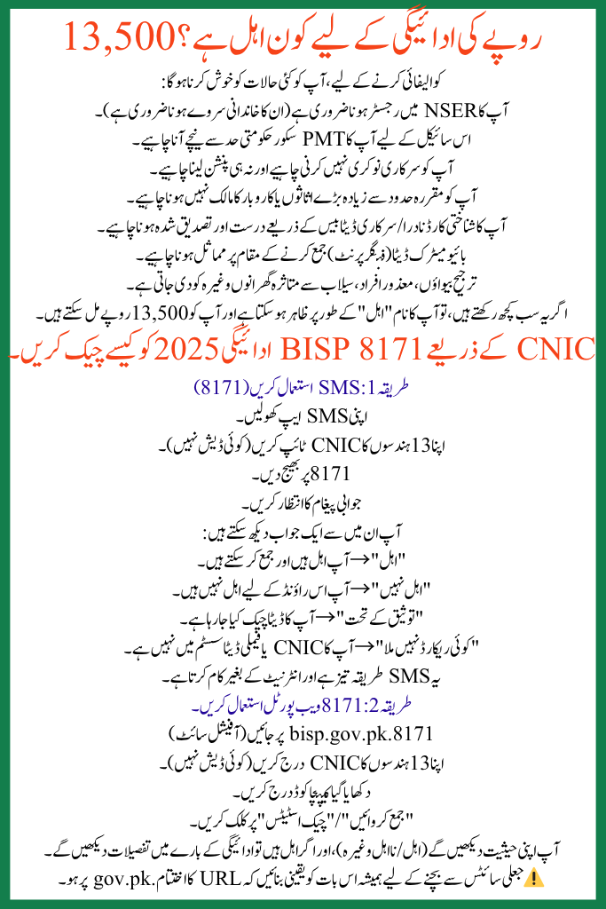 | BISP 8171 (April–June 2025) | 1 June 2025 | 30 June 2025 | Rs 13,500 | Via SMS 8171, via 8171 web portal, or BISP camps |
