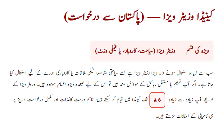 The most common visa for Pakistani applicants is the Visitor Visa. It is used for tourism, meeting family members, or short business trips. This visa allows you to stay in Canada for up to six months. However, if your goal is higher education or permanent residency, you will need to apply under different categories. For most travelers in 2025, the Visitor Visa is the easiest and fastest option.