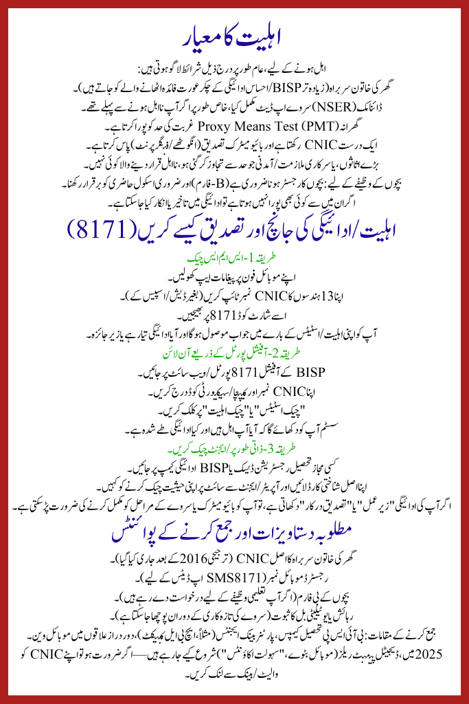 Ehsaas Program 8171 (BISP)Ongoing in 2025Continuous / quarterly cyclesCore quarterly payment approx. Rs 13,500 (from Jan 2025) + possible arrears + children’s stipendsCheck via SMS to 8171, online portal, or in-person registration / verification