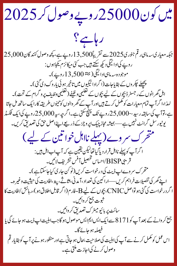 The programme occasionally allows a joint payout of about Rs 25,000 when arrears + the normal quarterly payment + children’s education stipends land together. According to the modern update for 2025, the core quarterly sum has been raised to Rs 13,500 and new digital sum choices (such as mobile folders and Sahulat Accounts) are existence rolled out — so it’s now even more important to confirm your status via CNIC check on the 8171 portal or by SMS before pregnant the full quantity.