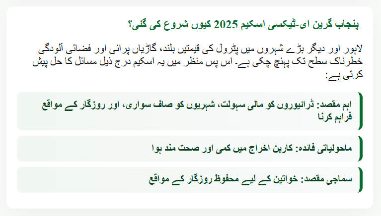 Cities like Lahore face high petrol costs, old and unsafe vehicles, and dangerous pollution levels. The Eligibility Criteria for Punjab Green E-Taxi Scheme 2025 aims to fix these issues by introducing electric taxis that are cleaner, cheaper, and safer. At the same time, it provides job opportunities for unemployed youth and women, helping them build stable careers while reducing environmental damage.