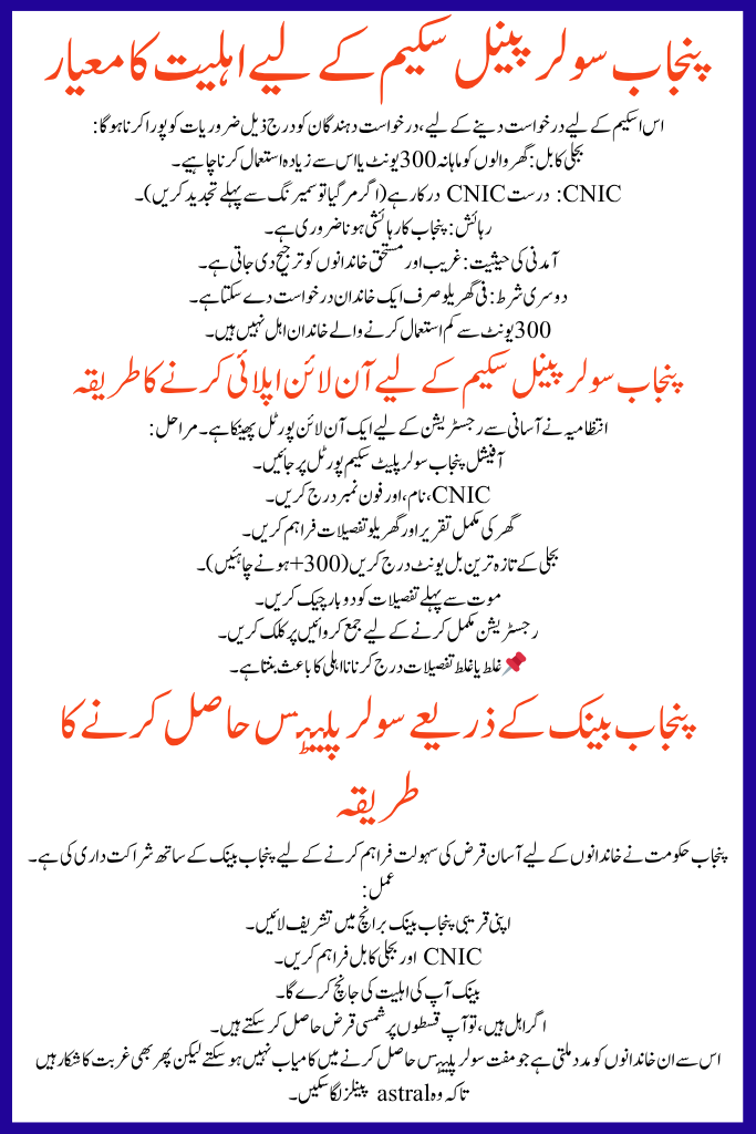 | Punjab Solar Panel Scheme 2025 | 2025 | Ongoing | Six free solar panels (per family) | Online & Bank (Punjab Bank) |