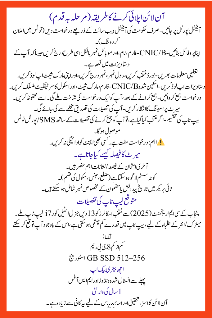 Note:As of now, no official announcement has been issued for a Matric & Midway laptop scheme in 2025. But Punjab and federal packages for higher educations are active. The instant a school-level round opens, students can smear.