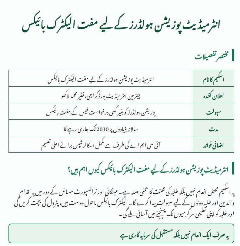 Education is the foundation of every nation’s success, and when young students achieve remarkable results, it’s not just a personal victory but pride for the whole country. The Government of Pakistan has launched a new initiative under which intermediate position holders will be given free electric bikes. This step will not only encourage students but also provide them with modern, eco-friendly transportation. For parents, this is a source of relief as their children’s hard work is being recognized, and for students, it’s a sign that their dreams are being turned into reality.