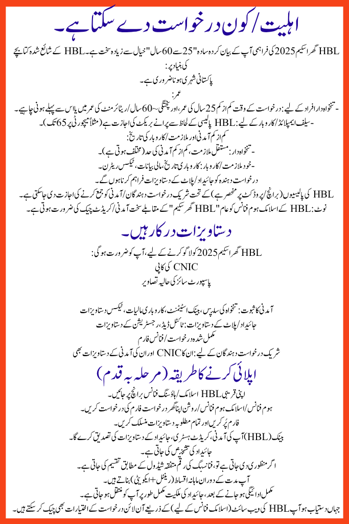 HBL Ghar Scheme 2025 supplies are stricter than the simple “25 to 60 years” idea you stated. Based on HBL’s published leaflets:
