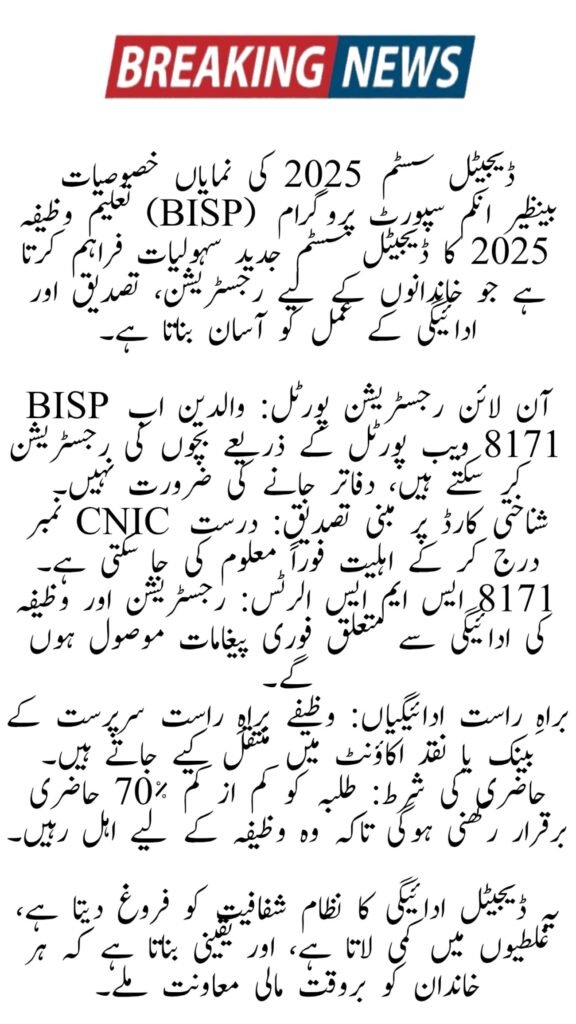 The Digital System for BISP Taleemi Wazaif 2025 introduces modern tools that simplify registration, verification, and payment tracking for families.