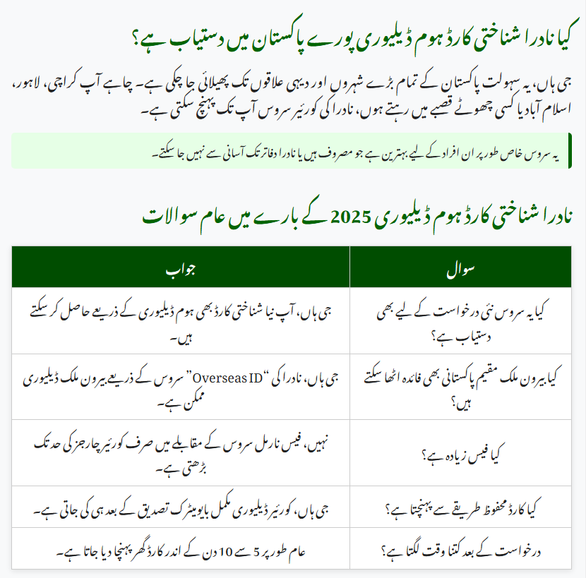 Can overseas Pakistanis use this service?Yes, NADRA’s “Overseas ID” service allows delivery abroad as well.