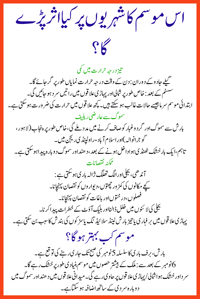 This forecast clearly marks a key seasonal shift for Pakistan: a strong westerly wave will transport rain, storms and the season’s first significant snowfall to many northern and hilly areas. With it comes a drop in both daytime and nighttime temperatures. The plains will get light rain and temporary relief from smog but should prepare for fog and colder nights.