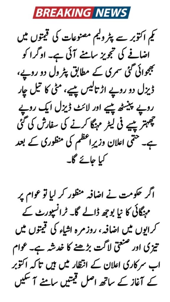 The October 1 price revision is part of Pakistan’s regular fuel adjustment cycle, but it also reflects the country’s vulnerability to global energy market shifts. If approved, the proposed hike will push inflation further and squeeze consumers already struggling with rising costs. Citizens should monitor official channels for confirmation as the government prepares its final announcement.