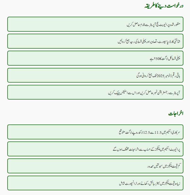 The cost under the government scheme is expected to be PKR 1.15 to 1.25 million, while private packages may vary depending on facilities.