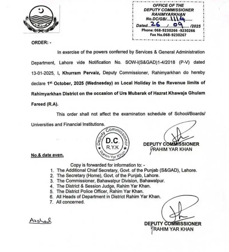 The Rahim Yar Khan District Administration has issued the official holiday notification: