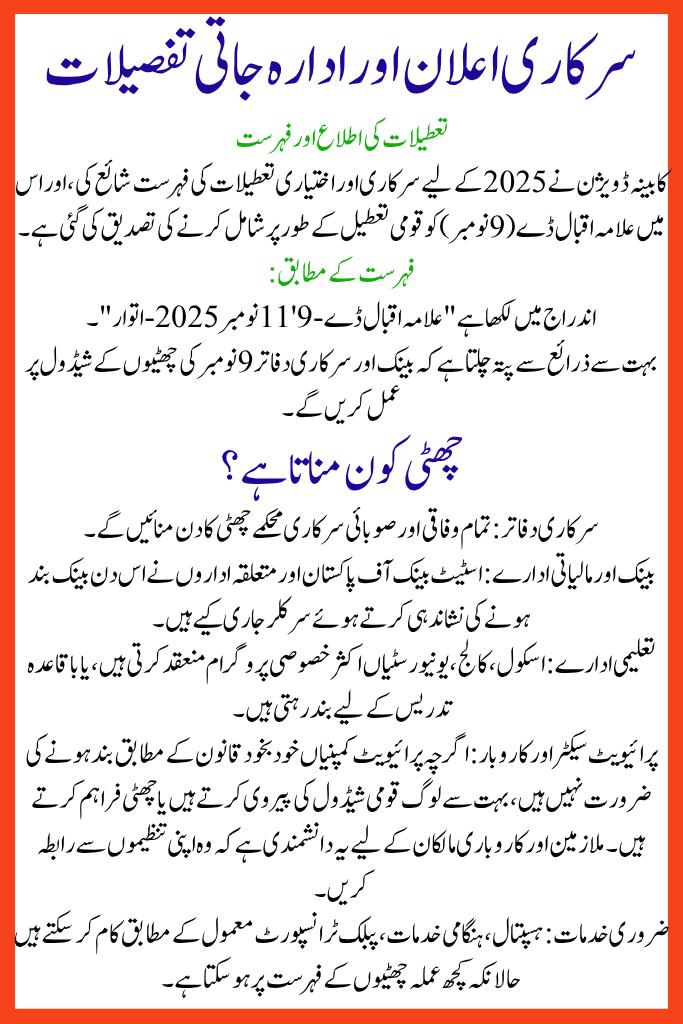 Iqbal Day (Allama Muhammad Iqbal)9 Nov 2025Nationwide Public HolidayFederal & provincial government offices, schools, universities, banks – private sector as per policy