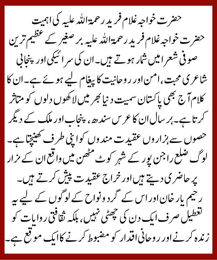 Hazrat Khwaja Ghulam Farid (RA) is regarded as one of the greatest Sufi poets of the subcontinent. His Saraiki and Punjabi poetry carries a message of love, peace, and spirituality. His verses still inspire millions across Pakistan and beyond. Every year, the Urs attracts thousands of devotees from Sindh, Punjab, and other parts of the country. People gather at his shrine in Kot Mithan, District Rajanpur, to pay their respects. For the people of Rahim Yar Khan and surrounding areas, this holiday is more than a break; it is a chance to revive cultural traditions and strengthen spiritual values.