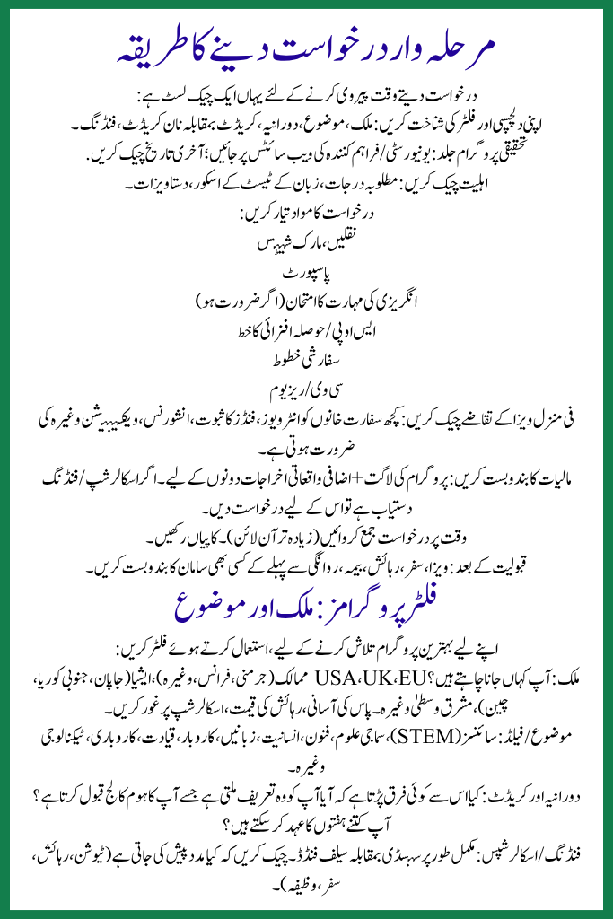 - Country: Where do you want to go? USA, UK, EU countries (Germany, France, etc.), Asia (Japan, South Korea, China), Middle East, etc. Consider pass ease, cost of living, scholarships.
