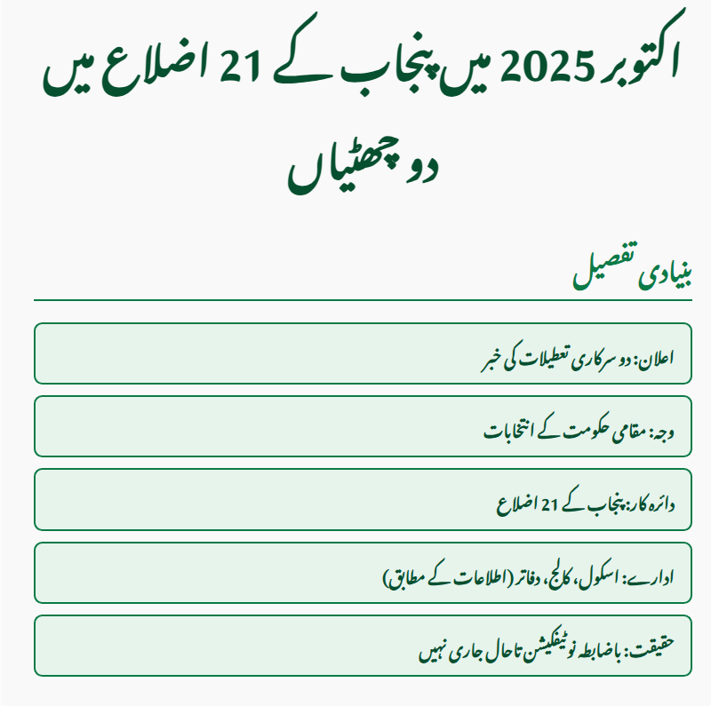 In short, social media and news outlets are reporting that two holidays have been announced in Punjab’s 21 districts for October 2025. However, the Punjab government and the Election Commission have not officially confirmed this yet. Citizens should avoid believing rumors and only rely on official notifications.