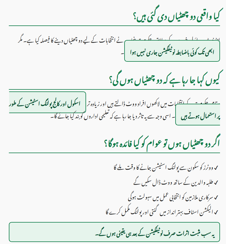 According to viral posts on social media and some news reports, the Punjab government has decided to give two holidays in certain districts for elections. The claim is that schools and government offices will be closed so polling can run smoothly. But until now, no official notification has been released by the government. That means the news remains unverified and based only on unofficial sources.