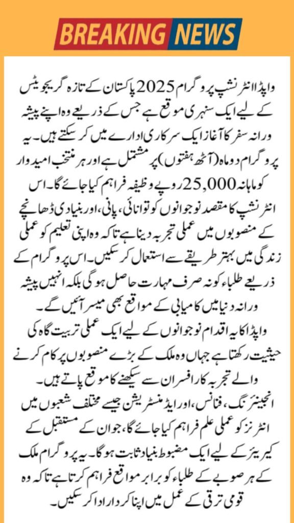 The Water and Power Development Authority (WAPDA) has officially launched the WAPDA Internship Program 2025, offering young graduates a valuable opportunity to gain real-world experience in one of Pakistan’s top public sector organizations. This paid internship provides a monthly stipend of Rs.25,000 for 8 weeks (2 months) and aims to build professional skills while contributing to the country’s energy and infrastructure projects.